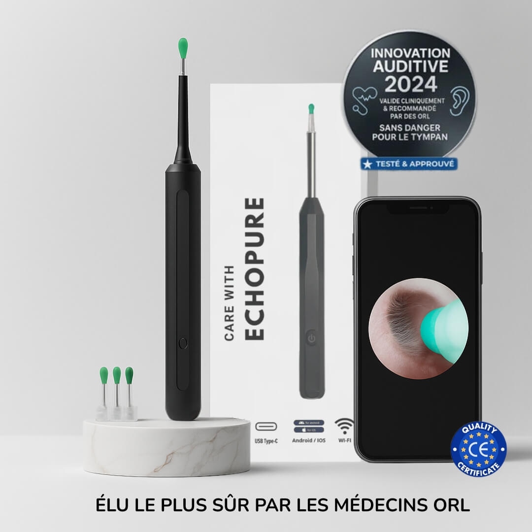 Découvrez la nouvelle référence approuvée par les ORL pour un nettoyage auriculaire sûr, précis et efficace. Grâce à sa caméra HD et ses embouts en silicone médical, EchoPure vous permet de garder vos oreilles propres en quelques instants, sans risque pour le tympan.